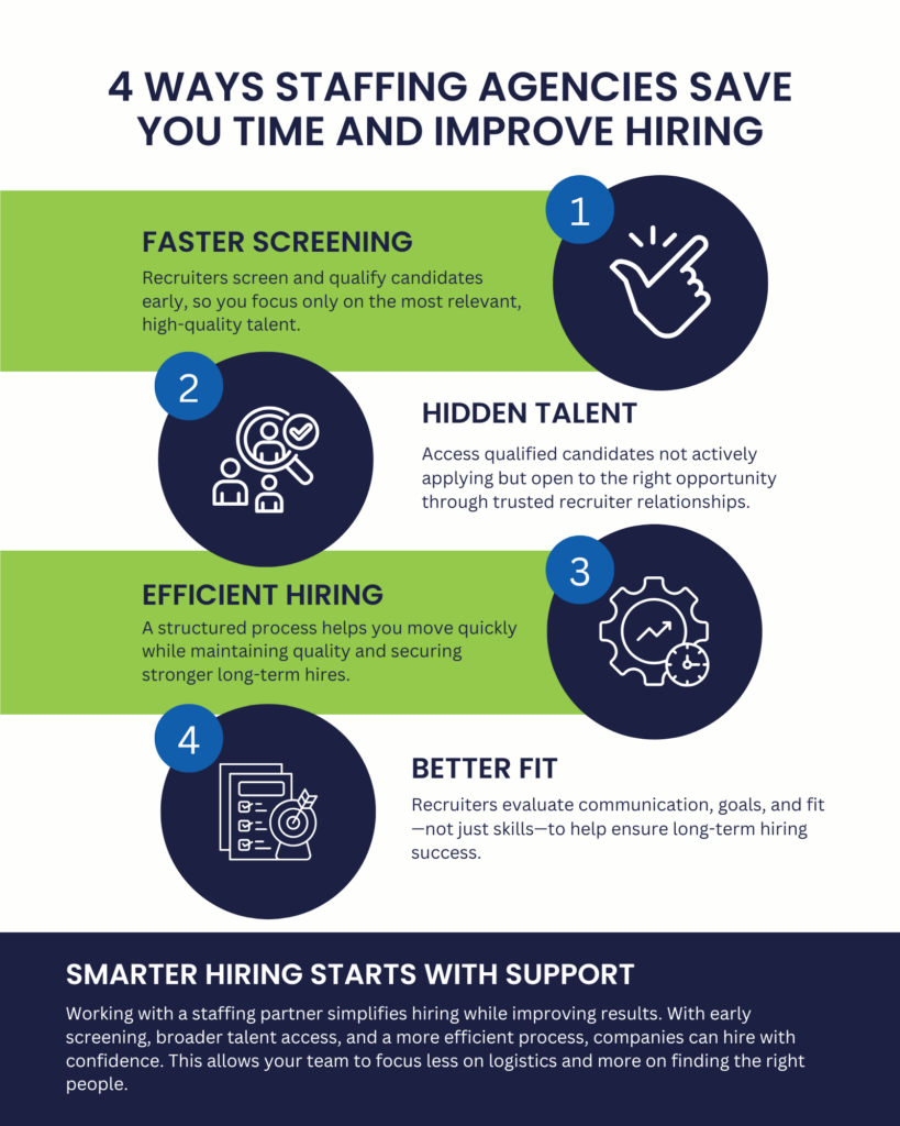 Not every great candidate is actively applying to job postings. Many are open to the right opportunity but aren’t spending time searching job boards. Staffing agencies build relationships with these professionals over time, helping connect companies with talent they may not have found through traditional channels.